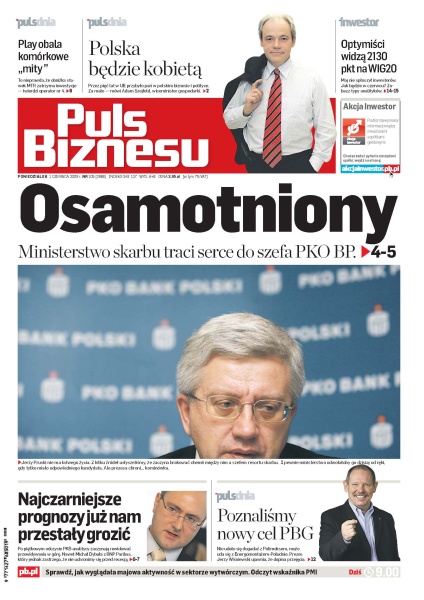 Ministerstwo skarbu traci serce do szefa PKO BP; Polki są bardziej przedsiębiorcze od koleżanek z UE; gospodarka ciągle rośnie, najczarniejsze wizje na 2009 nie sprawdziły się; operator komórkowy P4 burzy mity; niesnaski przy przygotowaniach do budowy kompleksu energetycznego pod Gubinem; PBG ma ochotę na Energomontaż; zmienność WIG20 spadła do poziomu z lata 2008 r.