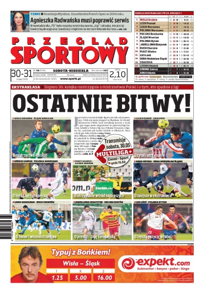 Dopiero 30. kolejka ekstraklasy rozstrzygnie o mistrzostwie Polski i o tym, kto spadnie z ligi; do RPA żony lecą za swoje - wywiad z Grzegorzem Lato; ŁKS Łódź nadal ma szansę na otrzymanie licencji na grę w ekstraklasie; rozmowa z Patrykiem Małeckim; stadion Ullevi w Goteborgu to najdłuższy i najbardziej pechowy tor cyklu Grand Prix; Agnieszka Radwańska zmierzy się nieprzewidywalną Kateryną Bondarenko; kulisy drogi Marcina Gortata do finału NBA.