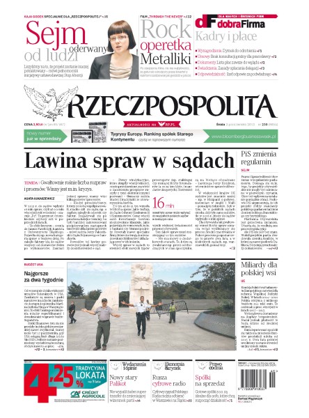 Gwałtownie rośnie liczba rozpraw i procesów – winny jest m.in. kryzys; opozycja chce większych uprawnień w Sejmie – projekt zmian nie jest bez szans, bo PSL się waha; „Through The Never” Metalliki w 3D to gwóźdź do trumny rocka.