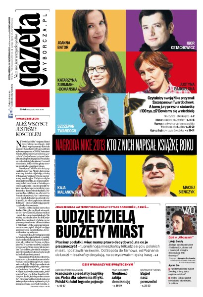 Czytelnicy swoją Nike przyznali Szczepanowi Twardochowi, a komu jury przyzna statuetkę; płacimy podatki, więc mamy prawo decydować, na co je przeznaczyć – mieszkańcy kilkudziesięciu polskich miast decydują, na co wydawać miejską kasę; 37% mieszkańców stolicy wybiera się na referendum w sprawie odwołania prezydent Warszawy, Hanny Gronkiewicz-Waltz.