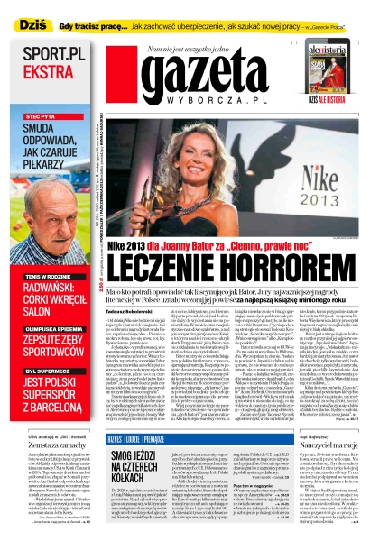 Leczenie horrorem – Nike 2013 dla Joanny Bator za „Ciemno, prawie noc” – mało kto potrafi opowiadać tak fascynująco jak Bator – jury najważniejszej nagrody literackiej w Polsce uznało wczoraj jej powieść za najlepszą książkę minionego roku; gdy tracisz pracę – jak zachować ubezpieczenie, jak szukać nowej pracy; zemsta za zamachy – USA atakuje w Libii i Somalii; smog jeździ na czterech kółkach – do 2020 roku zgodnie z ustaleniami z Unią Polska musi poprawić jakość powietrza – rząd ogłosił więc program antysmogowy, w którym planuje zastąpienie domowych pieców węglowych bardziej ekologicznymi; Sąd Najwyższy uznał, że nauczyciel ma rację – Cyprian, 38-letni wuefista z Krakowa, stracił pracę w liceum, nie został zwolniony, dyrektor szkoły nie podpisał z nim tylko kolejnej umowy na czas określony.