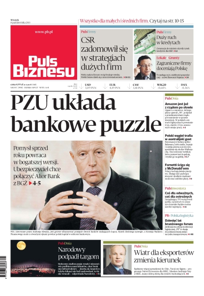 PZU układa bankowe puzzle – pomysł sprzed roku powraca w bogatszej wersji, ubezpieczyciel chce połączyć Alior Bank z BGŻ; CSR zadomowił się w strategiach firm – wielu małym firmom wciąż brakuje wiedzy, wielki biznes dzieli się z nimi doświadczeniem; duży ruch w kredytach – gwarancje de minimis ożywiły rynek kredytów dla MSP; Amazon jest już z rządem po słowie – gigant e-commerce podpisał z przedstawicielami rządu porozumienie w sprawie inwestycji; polski węgiel trafia w australijski gust – notowanej w Sydney spółce Balamara, która szuka, kupuje i rozwija aktywa surowcowe, spodobały się okolice Wałbrzycha; wiatr dla eksporterów zmienia kierunek – będziemy więcej sprzedawać do Chin, Turcji czy Egiptu; coś dla odważnych, coś dla ostrożnych – zarządzający TFI wytypowali spółki, na których w czwartym kwartale będzie można zarobić najwięcej.