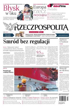 Smród bez regulacji – miała pomóc walczyć z przemysłowym odorem, ale ustawy nie będzie, rząd przerwał nad nią prace; błysk w oku, Tai Woffinden, nowy mistrz świata na żużlu – porzucił dawne nawyki i jest innym człowiekiem, trenował nawet sześć godzin dziennie – opłaciło się; Europa rzecz zwyczajna – od lat każdy sukces wspólnot jest nacjonalizowany, a każdy problem europeizowany – Janusz Lewandowski dla „Rz”; rosyjska gra o skarby Północy – nerwowa reakcja na protest Greenpeace’u na Morzu Barentsa oraz zapowiedź drakońskich kar dla jej uczestników pokazują, jak ważna dla Moskwy stała się Arktyka; Nobel za biologiczny transport – nagroda dla dwóch Amerykanów i Niemca; zmiany w Banku Światowym – nowa strategia „globalnych praktyk”; motocykl nie dla firmy – fiskus nie zgadza się na pełne odliczenie VAT od zakupu motocykla wykorzystywanego w firmie.