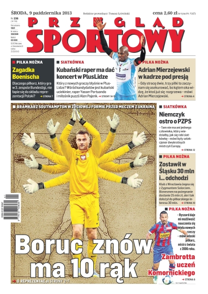 Boruc znów ma 10 rąk – bramkarz Southampton w życiowej formie przed meczem z Ukrainą; zagadka Boenischa – dlaczego piłkarz, który gra w 3. zespole Bundesligi, nie łapie się do składu reprezentacji Polski; kubański raper ma dać koncert w PlusLidze – który z nowych graczy błyśnie w PlusLidze – wśród kandydatów jest kubański uciekinier, raper Yasser Portuondo i miłośnik puzzli Alen Pajenk; Niemczyk ostro o PZPS – „Tam nie ma ani jednego człowieka, który wiedziałby, jak się robi siatkówkę” uważa były selekcjoner dwukrotnych mistrzyń Europy; zostawił w Śląsku 30 milionów i odchodzi – klub z Wrocławia żegna się z Zygmuntem Solorzem.