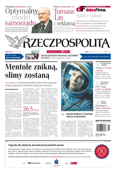 Mentole znikną, slimy zostaną – Parlament Europejski odrzucił zakaz sprzedaży cienkich papierosów, mentolowe będą jeszcze osiem lat; optymalny model samorządu – profesor Jerzy Regulski został laureatem pierwszej edycji Nagrody Fundament Rzeczypospolitej im. Michała Kuleszy; Tomasz Lis z reklamą – przypadek redaktora naczelnego „Newsweeka", który w tekście autorskim reklamował napój i hotel, powinien stać się wezwaniem do poważnej dyskusji; Sandra Bullock i George Clooney walczą w kosmosie – na nasze ekrany wchodzi jeden z najgłośniejszych filmów ostatnich miesięcy: „Grawitacja” Alfonsa Cuarona; Nobel za boską cząstkę – docenione odkrycie Englerta i Higgsa; PKP Cargo jedzie na giełdę – debiut przewoźnika ma przynieść 1,6 mld zł; parkingowy bilet w kieszeni – kwit z parkomatu nie musi być za szybą.