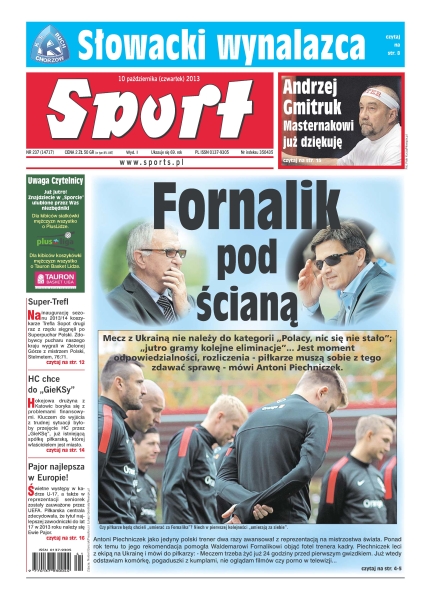 Fornalik pod ścianą – Antoni Piechniczek jako jedyny polski trener dwa razy awansował z reprezentacją na mistrzostwa świata – ponad rok temu to jego rekomendacja pomogła Waldemarowi Fornalikowi objąć fotel trenera kadry; Super-Trefl – na inaugurację sezonu 2013/14 koszykarze Trefla Sopot drugi raz z rzędu sięgnęli po Superpuchar Polski – zdobywcy pucharu naszego kraju wygrali w Zielonej Górze z mistrzem Polski Stelmetem; HC chce do „GieKSy” – hokejowa drużyna z Katowic boryka się z problemami finansowymi, kluczem do wyjścia z trudnej sytuacji byłoby przejęcie HC przez „GieKSę”; Pajor najlepsza w Europie – świetne występy w kadrze U-17, a także w reprezentacji seniorek zostały zauważone przez UEFA, piłkarska centrala zdecydowała, że tytuł najlepszej zawodniczki do lat 17 w 2013 roku należy się Ewie Pajor.