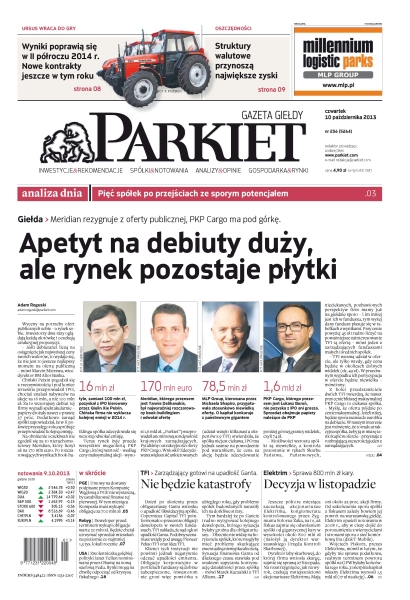 Apetyt na debiuty duży, ale rynek pozostaje płytki – Meridian rezygnuje z oferty publicznej, PKP Cargo ma pod górkę; Ursus wraca do gry – wyniki poprawią się w II półroczu 2014 roku, nowe kontrakty jeszcze w tym roku; struktury walutowe przynoszą największe zyski; analiza dnia – pięć spółek po przejściach ze sporym potencjałem; nie będzie katastrofy – zarządzający TFI gotowi na upadłość Ganta; Elektrim – decyzja w listopadzie w sprawie 800 milionów złotych kary; PGE – umowy na dostawy podpisane przez Kompanię Węglową z PGE nie wystarczą by ustabilizować finanse tej pierwszej, w tym miesiącu Kompania musi wykupić obligacje za 700 milionów złotych; Robyg – deweloper przed terminem wykupi obligacje warte 20 milionów złotych; zwolenniczka gołębiej polityki Janet Yellen nominowana przez Obamę na nową szefową Fedu.