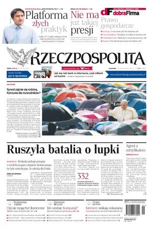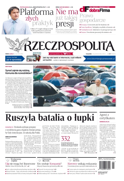 Ruszyła batalia o łupki – Bruksela szykuje przepisy o wydobyciu gazu z łupków, rośnie presja, by były restrykcyjne, ze szkodą dla Polski; Synod zajmie się rodziną, czy oznacza to komunię dla rozwodników – zwołany przez papieża Franciszka na październik przyszłego roku synod będzie poświęcony wyzwaniom duszpasterskim związanym z rodziną; agent z certyfikatem – od nowego roku nie będzie już licencji zawodowych dla pośredników i zarządców nieruchomości – likwiduje je ustawa deregulacyjna; kto uratuje Kompanię – kłopoty finansowe górniczej spółki; kierowcy unikają wskazania – umorzenia spraw opornych właścicieli aut; Platforma złych praktyk – „Politycy PO ciągle szukają na mnie haka i grzebią mi w życiorysie” – Piotr Guział, burmistrz Ursynowa.