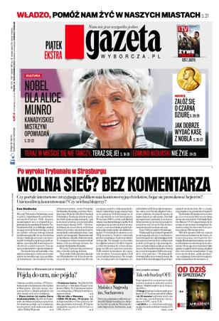 Wolna sieć? Bez komentarza – czy portale internetowe zrezygnują z publikowania kontrowersyjnych tekstów, bojąc się prowokować hejterów, uniemożliwią komentowanie, czy ucichną blogerzy; Malala z Nagrodą im. Sacharowa – rok temu pakistańscy talibowie postrzelili Malalę Yousafzai, bo chciała chodzić do szkoły – wczoraj dostała Nagrodę im. Sacharowa; pójdą do urn, czy nie pójdą – referendum w Warszawie już w niedzielę; tak odchudzą OFE – rząd ujawnił wczoraj wreszcie planowane zmiany w systemie emerytalnym – miałyby wejść w życie 31 stycznia 2014; Nobel dla Alice Munro – kanadyjskiej mistrzyni opowiadań.