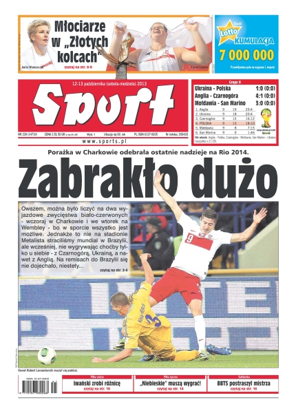 Zabrakło dużo – porażka w Charkowie odebrała ostatnie nadzieje na Rio 2014; młociarze zgarnęli laury – Anita Włodarczyk i Paweł Fajdek zwycięzcami challenge'u „Sportu” i PZLA; Iwański robi różnicę – hokejowy system rozgrywania sparingu przyniósł... hokejowe rozstrzygnięcie; Vettel pokazał plecy – Sebastian Vettel, który cztery razy z rzędu sięgnął po pole position w Suzuce i wygrał tam trzy z ostatnich czterech wyścigów, uzyskał najlepszy czas w piątkowych treningach; beniaminek postraszył – zespół z Podbeskidzia mile zaskoczył, starał się walczyć jak równy z równym i stawiał silny opór.