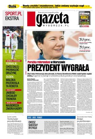 Zbyt niska frekwencja zdecydowała, że Hanna Gronkiewicz-Waltz nadal będzie rządzić stolicą, i zapewne wystartuje w wyborach za rok, by powalczyć o trzecią kadencję; renty zwykłe i mundurowe – jakie zmiany szykuje rząd, jakie warunki trzeba spełnić, aby otrzymać prawo do renty; Kościół i pedofilia – trzeba badać przyszłych księży; czemu auta z USA są takie tanie; nowa książka Helen Fielding – Bridget po pięćdziesiątce.