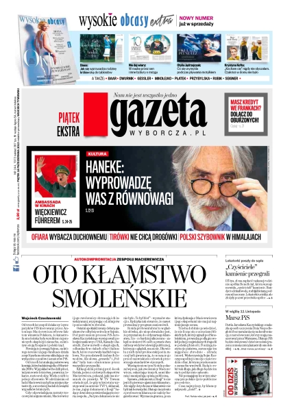 135 tys. zł zapłaci nękanej rodzinie spółka, która wynajmowała „czyścicieli” kamienic – bandyci odcinali lokatorom wodę, rozbijali ściany, podrzucali martwe szczury; po sprawie Radka Agatowskiego są szanse, że na wolność wyjdą inni „nieporadni umysłowo” więźniowie; partia Jarosława Kaczyńskiego 10 listopada najpierw uczci ofiary katastrofy smoleńskiej, potem odda hołd marszałkowi Józefowi Piłsudskiemu – unika w ten sposób konfrontacji z narodowcami 11 listopada; Ameryka wraca do normalności po 16 dniach paraliżu państwa, a oskarżani o jego wywołanie Republikanie szukają w swoich szeregach winnych.