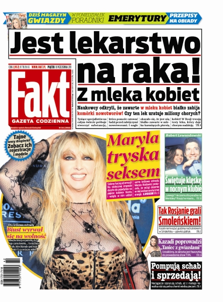 Naukowcy odkryli, że zawarte w mleku kobiet białko zabija komórki nowotworów, czy ten lek uratuje miliony chorych; Robert Lewandowski świętuje klęskę w nocnym klubie; tak Rosjanie grali Smoleńskiem; Kazadi poprowadzi „Taniec z gwiazdami”; zobacz jak naciągacze szprycują schab; biust Maryli wyrwał się na wolność.