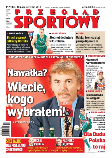 Zbigniew Boniek w specjalnym wywiadzie; strach ogarnął piłkarzy Górnika – mam nadzieję, że trener Nawałka nie zostanie selekcjonerem – mówi obrońca klubu z Zabrza Boris Pandža; Stelmet debiutuje w Eurolidze – Łukasz Koszarek i jego koledzy w pierwszym meczu zmierzą się z Bayernem Monachium; działacze żużlowi myślą o wprowadzeniu ograniczeń zarobków zawodników i już mają gotowe pomysły, jak je… obejść.
