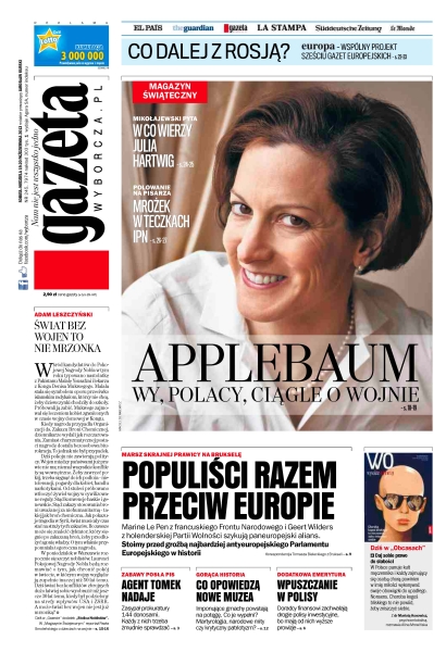 Marine Le Pen z francuskiego Frontu Narodowego i Geert Wilders z holenderskiej Partii Wolności szykują paneuropejski alians; agent Tomek nadaje – zasypał prokuratury 144 donosami, każdy z nich trzeba żmudnie sprawdzać; imponujące gmachy powstają na potęgę – co je wypełni, martyrologia, narodowe mity czy krytyczny patriotyzm; doradcy finansowi zachwalają drogie polisy inwestycyjne, bo mają od nich wyższe prowizje; rozmowa z Anne Applebaum.