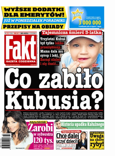 Tajemnicza śmierć 3-latka – Kubuś był tylko lekko przeziębiony, mama dała mu syrop i leki, zaczął sinieć i się dusić...; Edyta Górniak zarobi w sylwestra120 tys.; historia upadku Kałużnego – jak to się stało, że gwiazda reprezentacji pracuje w pakowalni; Agnieszka K., która ma dziecko z 14-letnim uczniem, chce wrócić do szkoły.
