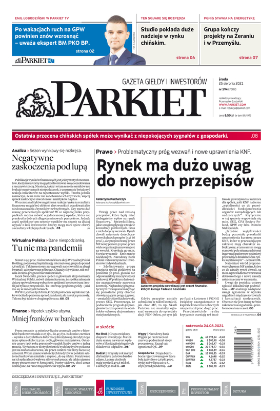 Największy w Polsce newsroom gospodarczy zbiera, analizuje i zgłębia dla Państwa najważniejsze informacje ze świata finansów. Codzienne wydanie „Parkietu”, sześć dni w tygodniu, to kilkadziesiąt artykułów o emitentach, instytucjach finansowych, gospodarce. To również opinie, felietony i wywiady z najważniejszymi ludźmi krajowej i globalnej finansjery.