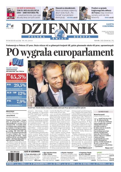 PO wygrało wybory do Parlamentu Europejskiego, jednakże frekwencja w Polsce była o wiele niższa niż w głównych krajach UE; brazylijskie ekipy ratownicze wyłowiły sześć ciał ofiar katastrofy samolotu Air France; FBI zdemaskowało agentów, którzy od 30 lat szpiegowali w USA dla kubańskich komunistów; fatalna postawa polskich piłkarzy w przegranym 0:1 meczu z RPA; Włodzimierz Lubański opowiada, jak żyli sportowcy w czasach PRL-u.