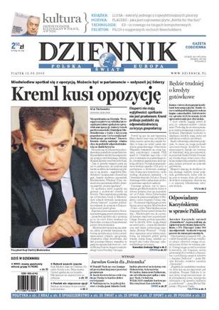 Niespodzianka na Kremlu – wczoraj po raz pierwszy od kilku lat rosyjski prezydent spotkał się z przywódcami opozycji; PO udało się zastopować projekty ustawy o pomocy dla firm; Jarosław Kaczyński i Zbigniew Ziobro wystąpili wspólnie, by uspokoić powyborcze emocje w PiS-ie; Kościół ostro krytykuje zachowanie osób publicznych i apeluje do wiernych o moralność; Światowa Organizacja Zdrowia ogłosiła szósty – najwyższy – stopień zagrożenia grypą.
