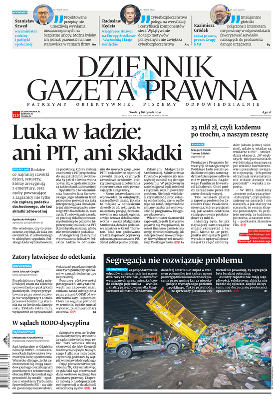 Gazetę wzbogacają praktyczne dodatki dla specjalistów, niedostępne w kioskach: Księgowość i Podatki, Rachunkowość i Audyt, Firma i Prawo, Samorząd i Administracja, Prawnik, Kadry i Płace, Ubezpieczenia i Świadczenia. NOWOŚĆ 2021 r. dodatki Biuro Rachunkowe i Księgowość Budżetowa (dostępne raz w miesiącu). Dodatkowo publikujemy wyjątkowo cenione przez Czytelników specjalne dodatki dotyczące najważniejszych zmian, nowych rozwiązań, na gorąco odpowiadamy na pytania. Piszemy o pracy zdalnej, o tarczach antykryzysowych, o nowych przepisach do walki z epidemią, o sposobach walki z zatorami płatniczymi i nowych obowiązkach pracodawców. Zapewniamy bezpieczeństwo w stosowaniu zmieniającego się prawa.