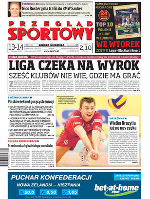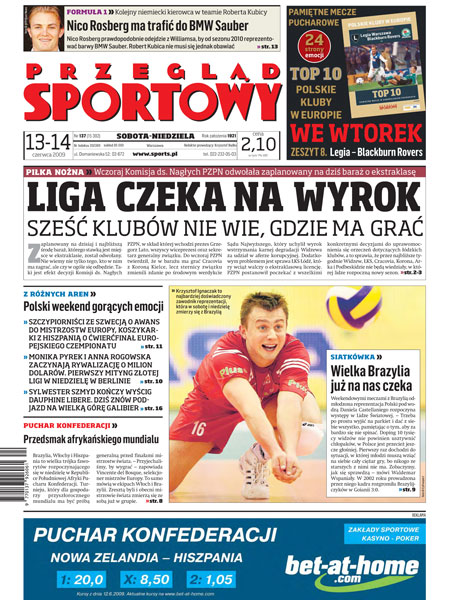 Wczoraj Komisja ds. Nagłych PZPN odwołała zaplanowany na dziś baraż o ekstraklasę; odmłodzona reprezentacja Polski pod wodzą Daniela Castellaniego meczami z Brazylią rozpoczyna występy w Lidze Światowej; wywiad z Pawłem Kosmalą: przewodniczący Rady Nadzorczej Legii Warszawa uważa, że zeszły sezon nie był wcale stracony; Jerzy Dudek rozpatruje w tej chwili cztery opcje transferów; próba generalna dla Afryki - w niedzielę startuje Puchar Konfederacji; Grand Prix Danii - Sebastian Ułamek chce wreszcie zagrozić gwiazdom; Urszula Radwańska odpadła w 1/4 finału w Birmingham i zaczyna kwalifikacje w Eastbourne; wywiad z Sylwestrem Szmydem, zwycięzcą z Mont Ventoux.