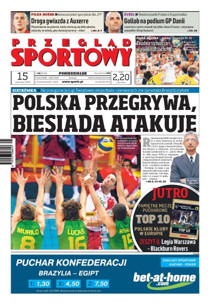 Siatkarska reprezentacja Polski zaczęła występy w Lidze Światowej od dwóch wyjazdowych porażek z Brazylią; wywiad z Bogdanem Wentą; Real Madryt zmobilizował do działania całą Europę; zasłużyłem na porządną podwyżkę - wywiad z Ireneuszem Jeleniem; czy Arkadiusz Warzycha dostanie szansę w byłym klubie swojego ojca; Jacek Zieliński mówi o przyszłości Lecha; aby mnie zniszczyć, wynajęto agencję od czarnego PR - rozmowa z Januszem Biesiadą; Tomasz Gollob znów na podium.