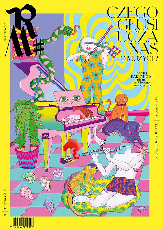Czego głusi nas uczą o muzyce? Michał Mendyk i Izabela Smelczyńska rozmawiają z Martą Abramczyk, Piotrem Baltynem i Adamem Stoyanovem – członkami prowadzonej przez Huberta Zemlera Głuchej Orkiestry Perkusyjnej. Doświadczeniami pracy z niesłyszącymi wykonawcami dzieli się w tym numerze kompozytor Piotr Klimek. Mateusz Borkowski kreśli portret słynnej głuchej perkusistki Evelyn Glennie.