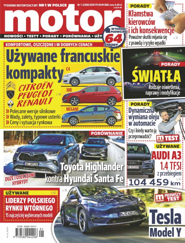 NOWOŚCI: elektryczne prototypy Toyoty i Lexusa; PORÓWNANIE, TESTY: Tesla Model Y Long Range; Hyundai Santa Fe 1.6 T-GDI HEV, Toyota Highlander 2.5 Hybrid Dynamic Force AWD-i; Nissan Qashqai 1.3 DIG-T MHEV Xtronic 4WD; BMW M240i xDrive Coupe, Volkswagen Golf R; Dacia Spring; PORADY: ile daje dynamiczna wymiana oleju; nie oszukuj - to się nie opłaca; co trzeba wiedzieć o typach świateł, ich naprawach i stosowaniu LED-ów; zimowe mandaty i pułapki; UŻYWANE: Seat Leon II; używane auta premium; liderzy rynku 2021; Citroen C4, Peugeot 308, Renault Megane; Audi A3 1.4 TFSI; MOTOPASJE: BMW 503; PLEBISCYT: Auto Lider 2022; STAŁE DZIAŁY: wiadomości oraz Motor Retro.