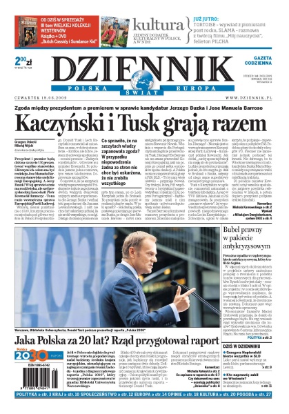 Zgoda między prezydentem a premierem w sprawie kandydatur Jerzego Buzka i Jose Manuela Barroso; poważna wpadka w rządowym pakiecie antykryzysowym, który trafił do Sejmu; Grzegorz Napieralski bierze wszystko w SLD; kto naprawdę zabił we Włodowie; jaka będzie Polska za 20 lat - rząd przygotował raport; Telewizja n rezygnuje z kanału szefa WOŚP; właścicielki firm nadal dyskryminowane; w reklamie oburza Polaków nagość, ale nie przemoc; Berlin broni Chodorkowskiego; Moskwa i Pekin walczą o surowce Azji Środkowej. Dodatki: The Wall Street Journal, Warszawa.