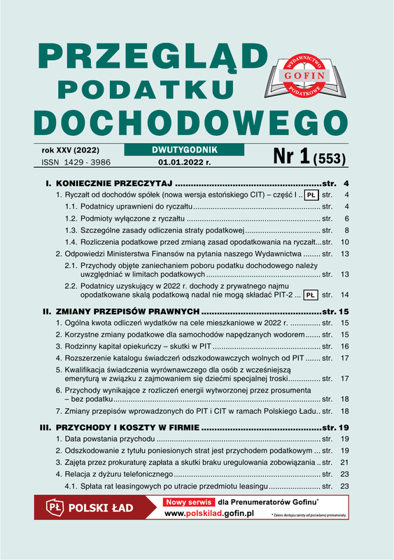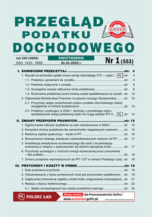Przegląd Podatku Dochodowego - dwutygodnik zajmuje się tematyką podatku dochodowego (PIT i CIT). W każdym numerze na 68 stronach znajduje się mnóstwo porad dotyczących m.in. rozliczania przychodów i kosztów, obowiązków płatnika, amortyzacji, opodatkowania dochodów z zagranicy, uznawania wydatków za koszt uzyskania. Na bieżąco publikowane są informacje o zmianach w prawie, prezentowane jest aktualne orzecznictwo, interpretacje organów podatkowych oraz wyjaśnienia Ministerstwa Finansów.