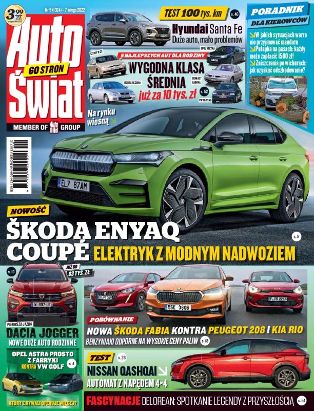 Najnowsze dziecko czeskich inżynierów: Škoda Enyaq Coupé iV RS; Hyundai Santa Fe - duże auto, mało problemów; 5 najlepszych aut dla rodziny za 10 tys. złotych; pierwsza jazda Dacią Jogger; nowa Škoda Fabia kontra Peugeot 208 i Kia Rio; w jakich sytuacjach warto nie przyjmować mandatu; jak uzyskać odszkodowanie za zniszczenia po wichurach.