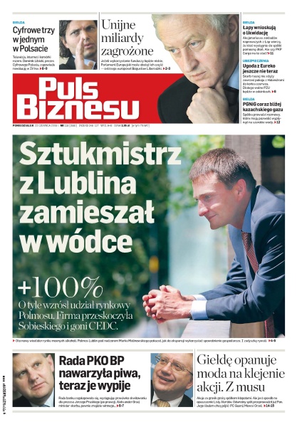 Niski poziom wydatkowania przez Polskę unijnych pieniędzy grozi ich utratą; Rynek mocnych alkoholi ma nowego wicelidera, Polmos Lublin zanotował najlepszy wynik w historii; rada PKO BP zagalopowała się, występując przeciwko skwitowaniu dla prezesa Jerzego Pruskiego, teraz poniesie konsekwencje; Cyfrowy Polsat połączy w jedną ofertę telewizję, internet i komórki; zakłady naprawcze Łapy chcą już tylko likwidacji; nadchodzi moda na odwrotne splity.