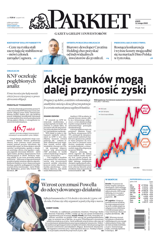 Największy w Polsce newsroom gospodarczy zbiera, analizuje i zgłębia dla Państwa najważniejsze informacje ze świata finansów. Codzienne wydanie „Parkietu”, sześć dni w tygodniu, to kilkadziesiąt artykułów o emitentach, instytucjach finansowych, gospodarce. To również opinie, felietony i wywiady z najważniejszymi ludźmi krajowej i globalnej finansjery.