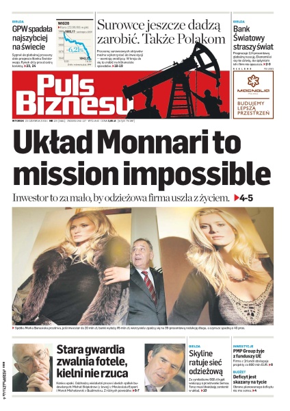Inwestor to za mało, by odzieżowa firma uszła z życiem; 44 proc. przedsiębiorstw przewiduje poprawę wyników w 2009 r.; prezesi Mostostalu i Budimeksu odchodzą ze swoich stanowisk; PM Group Polska żyje z unijnych funduszy; Skyline chce ratować Semax; coraz mniej osób stanu wolnego stać na własne mieszkanie; inwestowanie w budowę sklepów przestaje się opłacać; krajowi inwestorzy mają kilkanaście sposobów, aby zarobić na surowcach; czarny poniedziałek na warszawskiej giełdzie.