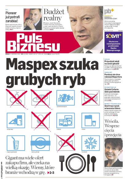 Analitycy i szefowie firm spożywczych zgodnie oceniają, że nadszedł dobry moment na przejęcia w branży; rząd ogłosił, że deficyt budżetowy wyniesie w 2009 roku 27 mld zł; za miesiąc rozpocznie się prywatyzacja Centrali Farmaceutycznej Cefarm, ostatniego państwowego dystrybutora leków; Onet traci udział w rynku – odsetek internautów korzystających z tego portalu spadł przez rok o 5,7 punktu procentowego.