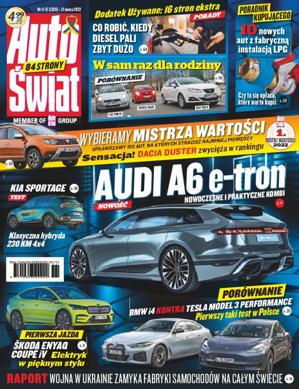 Audi A6 e-tron - nowoczesne i praktyczne kombi; Kia Sportage, klasyczna hybryda 230 KM 4x4; BMW i4 kontra Tesla Model 3 Performance; co robić, kiedy diesel pali zbyt dużo; 10 nowych aut z fabryczna instalacja LPG; 100 aut, na których stracisz najmniej pieniędzy; wojna w Ukrainie zamyka fabryki samochodów na całym świecie.