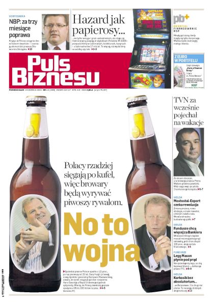 W ubiegłym roku Polacy wydali na hazard 17 mld zł – kto zarobił na tym najwięcej; w ciągu dwunastu miesięcy sprzedaż piwa w Polsce spadła o 1,5 %, branża piwowarska z niepokojem patrzy w przyszłość; w jaki sposób czerwcowe opady zaszkodziły stacji TVN; według ekonomistów NBP, dno kryzysu gospodarczego czeka nas już w III kwartale tego roku; akcjonariusze dużych spółek mogą czuć się zawiedzeni sytuacją na GPW.
