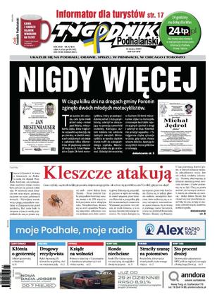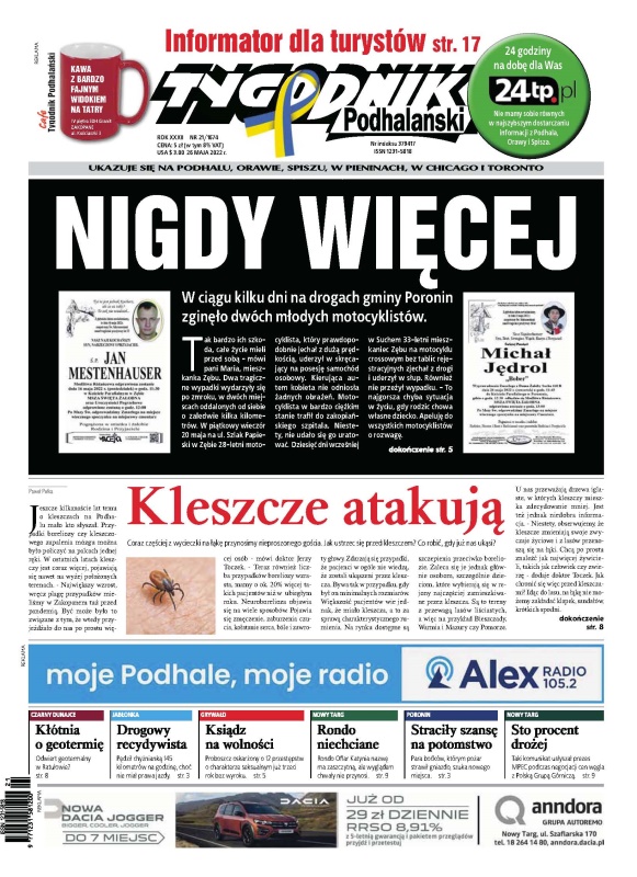 W ciągu kilku dni na drogach gminy Poronin zginęło dwóch młodych motocyklistów; Coraz częściej z wycieczki na łąkę przynosimy nieproszonego gościa. Jak ustrzec się przed kleszczem, co robić, gdy już nas ukąsi; Kłótnia o geotermię; Drogowy recydywista; Ksiądz na wolności; Rondo niechciane; Sto procent drożej; Informator dla turystów.