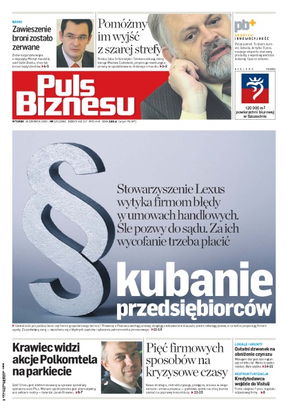 Ministerstwo Finansów i PIIT mają różne sposoby walki z szarą strefą na portalach aukcyjnych – w grę wchodzą miliardy złotych obrotów, transakcje na Allegro to już 0,5% polskiego PKB, banki walczą o depozyty klientów i własną płynność, Orlen chce sprzedać akcje Polkomtela, Fortis Bank przejmuje akcje Vistuli w zamian za długi firmy, grupa poznańskich prawników z firmy Lexus skubie firmy za niezgodne z prawem zapisy w umowach, maleje popyt na powierzchnie biurowe, w jaki sposób giełdowe firmy walczą z dekoniunkturą, Mark Mobius o trendzie i zmienności na giełdach, dodatek „Innowacyjność”.