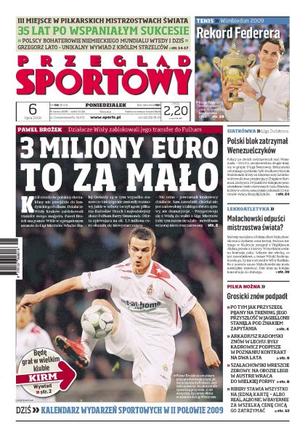 Działacze Wisły Kraków zablokowali transfer Pawła Brożka do Fulham – chcą, by napastnik pomógł im w eliminacjach do Ligi Mistrzów; kalendarz wydarzeń sportowych w drugiej połowie 2009 roku; wywiad z Filipem Burkhardtem, piłkarzem Arki Gdynia; w Lidze Światowej Polacy awansowali na drugie miejsce w grupie D; rozmowa z Samem Colonną, trenerem Andrzeja Gołoty; Roger Federer zdobył piętnasty tytuł wielkoszlemowy.