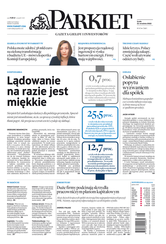 Największy w Polsce newsroom gospodarczy zbiera, analizuje i zgłębia dla Państwa najważniejsze informacje ze świata finansów. Codzienne wydanie „Parkietu”, sześć dni w tygodniu, to kilkadziesiąt artykułów o emitentach, instytucjach finansowych, gospodarce. To również opinie, felietony i wywiady z najważniejszymi ludźmi krajowej i globalnej finansjery.