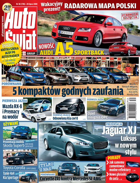 Auto tygodnia: Audi A5 Sportback, test pięciu praktycznych kompaktowych samochodów rodzinnych; Opel Insignia w wersji OPC; ekologiczne Mazdy RX-8 i Premacy; wakacje z kamperem na podwoziu Volkswagena T5; nowy Jaguar XJ; relacja z 24 Rajdu Karkonoskiego; jak jeździć po autostradach; samodzielny montaż nowych reflektorów; wybór głośników; auta używane: Skoda Superb; Corvette ZR1 i Mercedes SL 65 AMG - supersportowce na torze testowym.