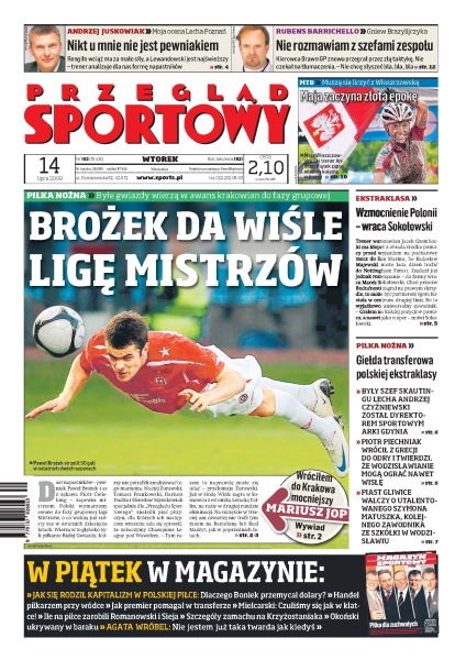 Wywiad z obrońcą Wisły Kraków, Mariuszem Jopem; Żurawski, Frankowski, Szymkowiak i Dudka o szansach Wisły w walce o Ligę Mistrzów; Andrzej Czyżniewski został dyrektorem sportowym Arki Gdynia; Tomasz Cywka i Tomasz Kupisz z Wigan przekonują, że to może być ich sezon; Ma ja Włoszczowska i jej trener Andrzej Piątek twierdzą, że muszą się z nimi liczyć najlepsi; Barrichello znowu stracił szansę na wygraną przez szefów Brawn GP; Marcin Gortat rozpoczął wczoraj w Łodzi serię treningów dla dzieci.