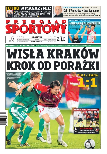 Gol Ćwielonga w 93. minucie uratował remis mistrzom Polski; powrót Szałachowskiego zmienił sposób gry legionistów; piłkarze Śląska Wrocław dyskutują z kierownictwem klubu o znacznym podwyższeniu ligowych premii; majbogatsze kluby we Francji na giełdzie transferowej wydają lub planują wydać więcej niż w poprzednich latach; Piotr Małachowski walczy o start w mistrzostwach świata w Berlinie; Przemysław Saleta zmienił rękawice bokserskie na Suzuki; wywiad z Adrianem Miedzińskim; budżety sześciu klubów koszykarskiej ekstraklasy zostały zakwestionowane; kolarze są przeciwni rezygnacji z elektroniki podczas wyścigu.