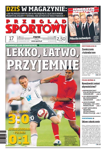 Wicemistrzowie Polski pewnie pokonali Gruzinów; dwa tygodnie przed początkiem sezonu nikt nie wie, kto zagra w ekstraklasie; dlaczego mistrz Polski zremisował z Levadią; Rafał Ulatowski pozyskał czterech wartościowych piłkarzy i zastanawia się nad czwartym; Metalist Charków chce zatrudnić bramkarza Iraklisu Wojciecha Kowalewskiego; wywiad z Jerzym Matlakiem; przez kryzys i kontuzje Pedersen jest biedniejszy o ponad 3 miliony złotych; Mark Webber, który w niedzielę wygrał swój pierwszy wyścig GP, mówi o Kubicy i fascynacji żużlem.
