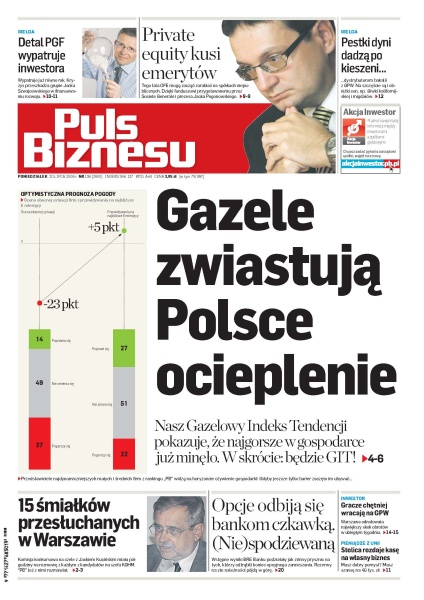 Gazelowy Indeks Tendencji pokazuje, że najgorsze w gospodarce już minęło; „PB” rozmawiał z 15 kandydatami na szefa KGHM; niknący popyt, nierzetelni kontrahenci i rozbujany złoty to główne bariery rozwoju firm; fundusz Societe Generale liczy na pieniądze OFE; nie ma inwestora dla nogi PGF; Warszawa daje po 40 tys. zł na rozpoczęcie działalności; inwestorzy powoli wracają na giełdy; rezerwy banków na złe należności będą wyższe, niż oczekiwano, zyski niższe.