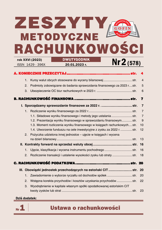 Zeszyty Metodyczne Rachunkowości - dwutygodnik szczegółowo wyjaśnia problemy związane ze stosowaniem ustawy o rachunkowości oraz Krajowych Standardów Rachunkowości. Prezentuje i omawia na przykładach liczbowych ewidencję zdarzeń gospodarczych, wycenę aktywów i pasywów, sporządzanie sprawozdań finansowych oraz stosowanie MSR. Wskazuje różnice między prawem bilansowym i podatkowym. Każdy numer zawiera 68 stron, w tym odpowiedzi na pytania Czytelników. Prezentowane rozwiązania ewidencyjne uwzględniają formę prawną danej jednostki i rodzaj działalności.