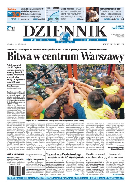 Ponad 50 rannych w starciach kupców z hali KDT z policjantami i ochroniarzami; rząd idzie na urlop, premier dał ministrom dwa tygodnie wolnego; tylko Polsce uda się uniknąć recesji; Farfał mianował Schymallę szefową telewizyjnej „Jedynki”; czy Europejski Trybunał Praw Człowieka uzna Chodorkowskiego za więźnia sumienia; prof. Safjan radzi maturzystom zaskarżyć klucz; chcemy rzucić palenie ale nie wiemy jak; coraz więcej mieszkańców Wysp rozstrzyga spory na podstawie Koranu. Dodatki: The Wall Street Journal Polska, Warszawa.