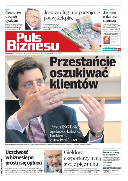 Brunon Bartkiewicz, prezes ING BSK apeluje do zarządów innych banków, aby były uczciwe względem swoich klientów; według najnowszych sondaży, wynagrodzenia w ujęciu realnym zaczną rosnąć dopiero w 2010 roku; organizatorzy mistrzostw Europy w koszykówce mają problem z pozyskaniem sponsorów; niemieccy przedsiębiorcy widzą poprawę w gospodarce – skorzystają na tym polscy handlowcy.