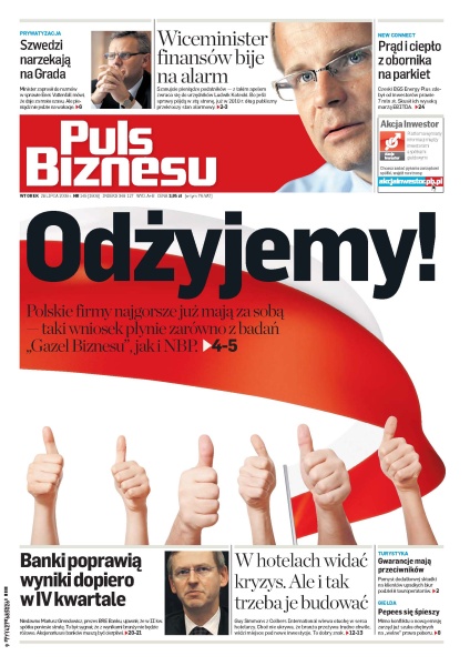 Z badań NBP wynika, że polskie firmy mają już za sobą najgorszy moment kryzysu finansowego; Ministerstwo Finansów alarmuje – dług państwa przekroczy w przyszłym roku drugi próg alarmowy; w sektorze nieruchomości wakacyjnych powstają nowe inwestycje, które mogą dać inwestorowi stopę zwrotu nawet na poziomie 9 proc.; rozmowa z Guy'em Simmonsem, dyrektorem w dziale inwestycji hotelowo-rekreacyjnych w Colliers International.